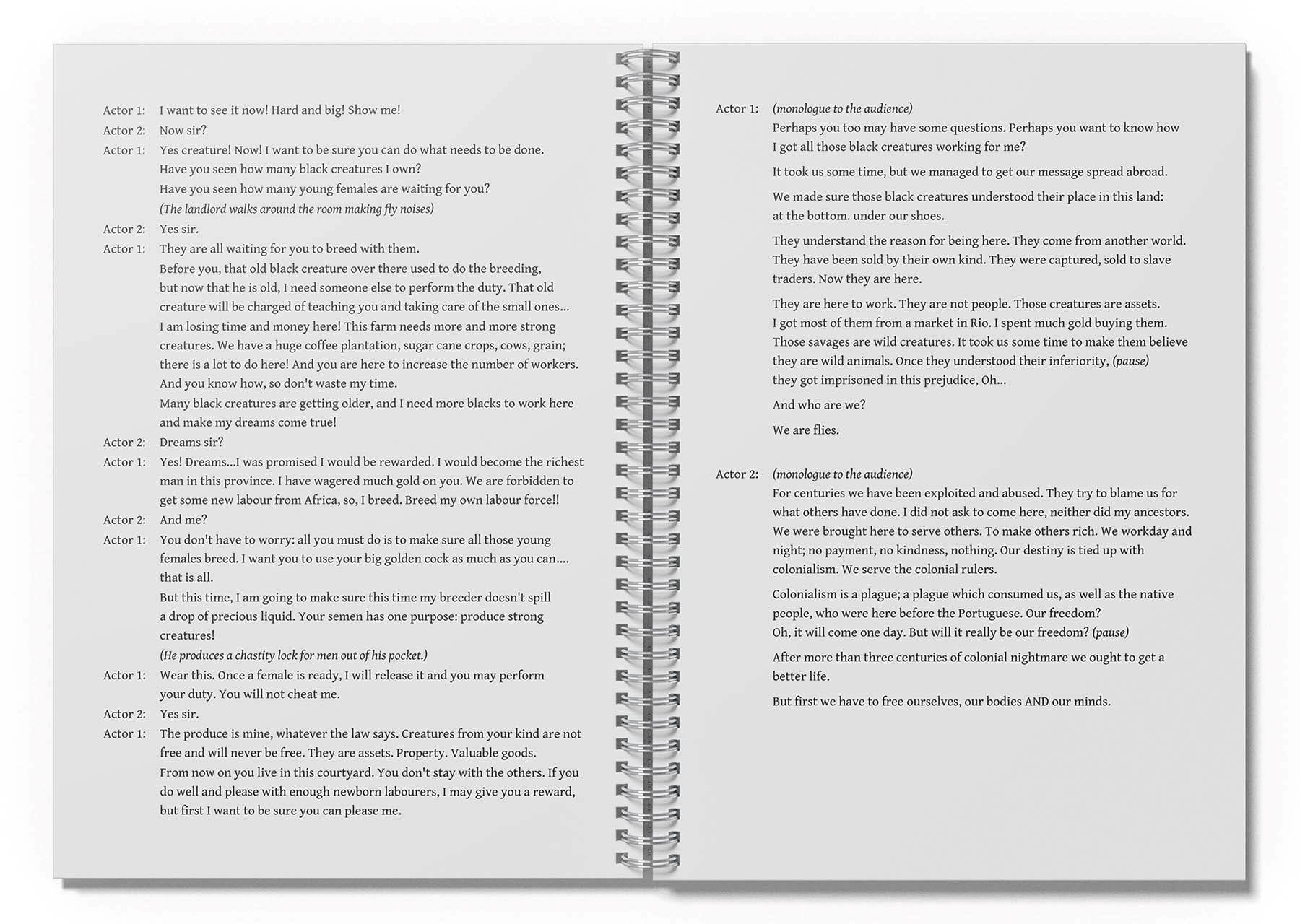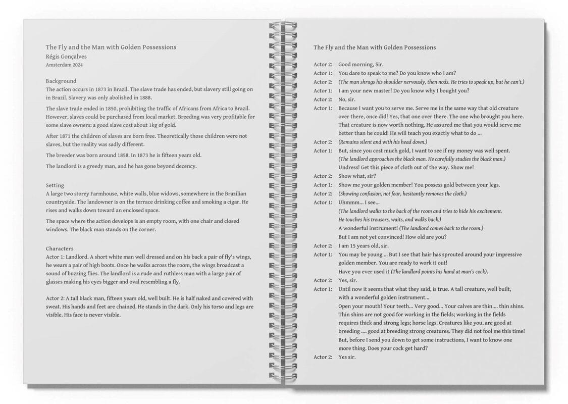 During the exhibition, part of this story gained an additional dimension through a short one-act play written by Régis Gonçalves himself. In a raw and uncompromising manner, the play reveals how colonial thinking penetrated even the most intimate sphere: the body as property, as economic investment. The dialogue is direct and unsettling, exposing the cruel logic behind the system of slavery and forced reproduction.
