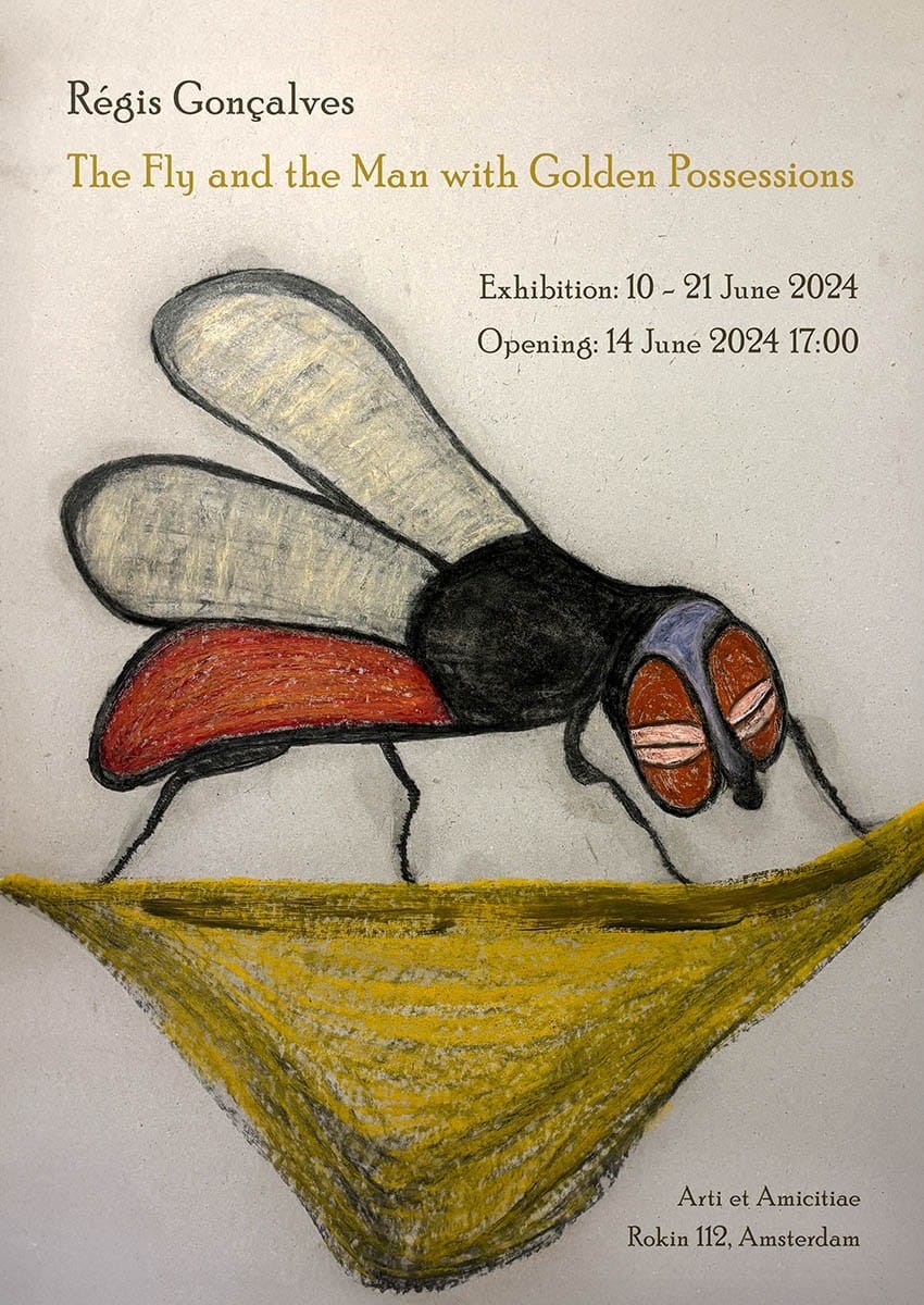 In June 2024, Régis Gonçalves presented the exhibition The Fly and the Man with Golden Possessions at Arti et Amicitiae. In June 2024, Régis Gonçalves presented the exhibition The Fly and the Man with Golden Possessions at Arti et Amicitiae. Born around 1860 in Minas Gerais, Brazil, he is said to have been used as a ‘breeding stallion’ on a plantation, where the owner forced him to impregnate enslaved women. This practice, which continued long after the abolition of slavery in Brazil in 1888, is scarcely documented, yet it survives in orally transmitted family histories.